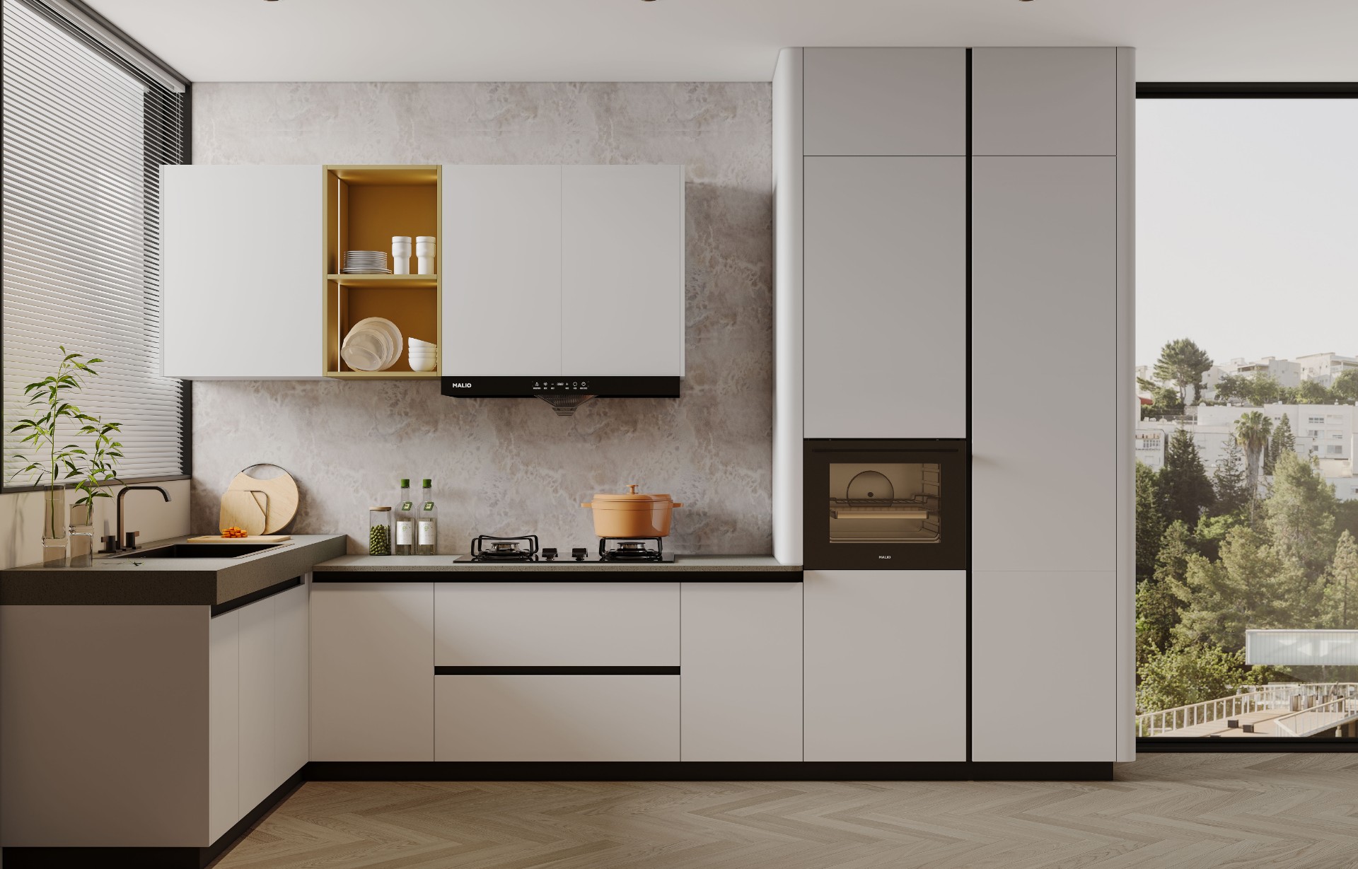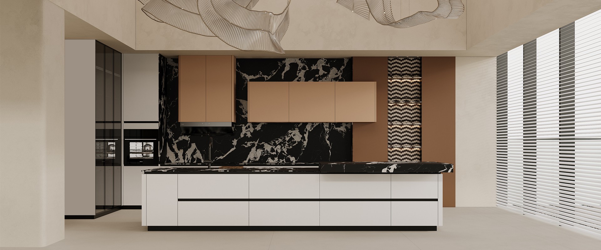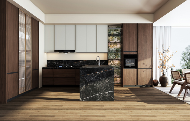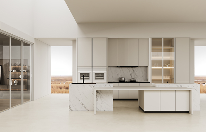 在廚柜設計中,地柜是采用抽拉方式,而吊柜采用的是平開方式,從設計美學來說,地柜是橫線條,吊柜是豎線條,歸納為“地橫吊豎